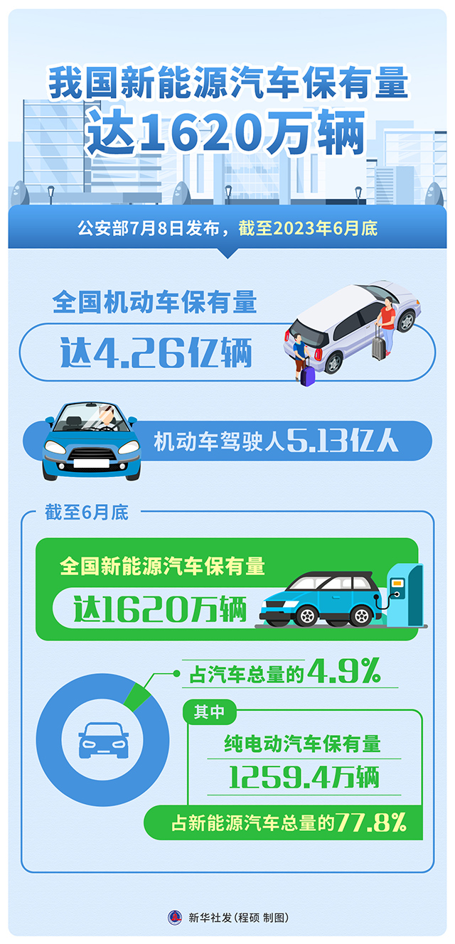 截至6月底,全国新能源汽车保有量达1620万辆,占汽车总量的4.9%。其中,纯电动汽车保有量1259.4万辆,占新能源汽车总量的77.8%。