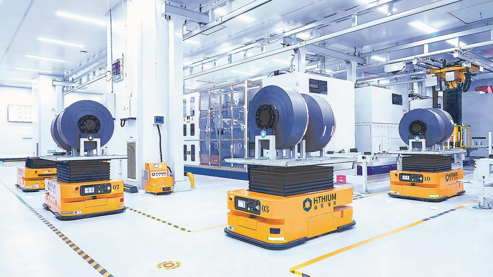在海辰智慧工厂,只见上下料机械臂、AGV机器人等自动化设备相互配合,辗转腾挪之间,完成了从电池材料到电芯的制造全过程,实现全流程数字化实时监测。