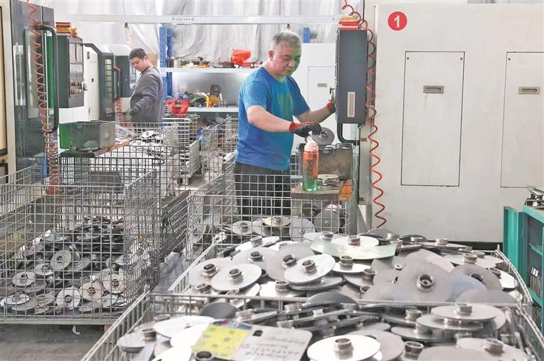 在建达流体车间,工人在生产电机电器零部件。