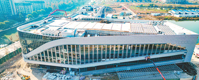近来,江苏昆山各重点工程项目抢修工期赶进度,确保如期完成各项任务目标。图为建设者在昆山市淀山湖全民健身中心进行外玻璃幕墙安装收尾工作。
