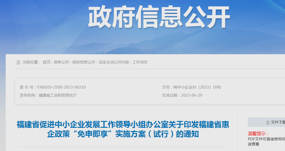 为推动惠企政策落地见效,持续激发市场主体活力,日前,省促进中小企业发展工作领导小组办公室(以下简称“省中小办”)结合我省实际,制定了《福建省惠企政策“免申即享”实施方案(试行)》(以下简称《实施方案》)。