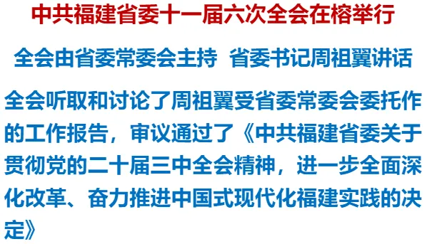 全会听取和讨论了周祖翼受省委常委会委托作的工作报告,审议通过了《中共福建省委关于贯彻党的二十届三中全会精神,进一步全面深化改革、奋力推进中国式现代化福建实践的决定》。周祖翼就《决定(讨论稿)》向全会作了说明。