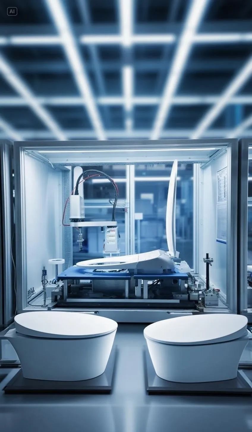 九牧集团生产车间内,设备正在对马桶盖进行数字化测试。(图片由AI辅助生成)