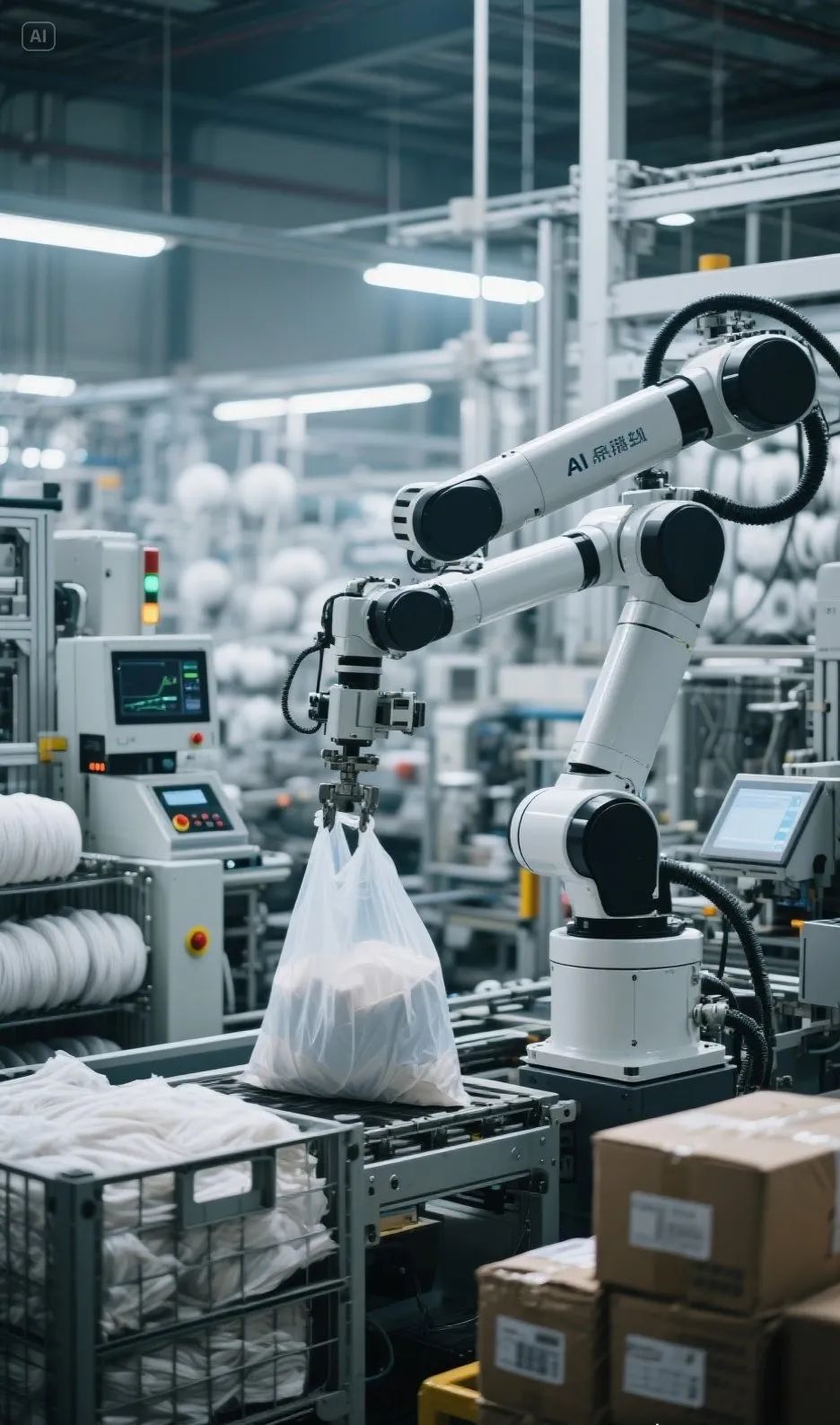 纺织车间内机器轰鸣,机器人自主作业,机械臂批量搬运,AI视觉检测设备精准地挑出瑕疵品,生产线自动套袋、码垛、包装……在位于福州市长乐区的恒申集团化纤板块生产车间内,你可以看到这样的场景。