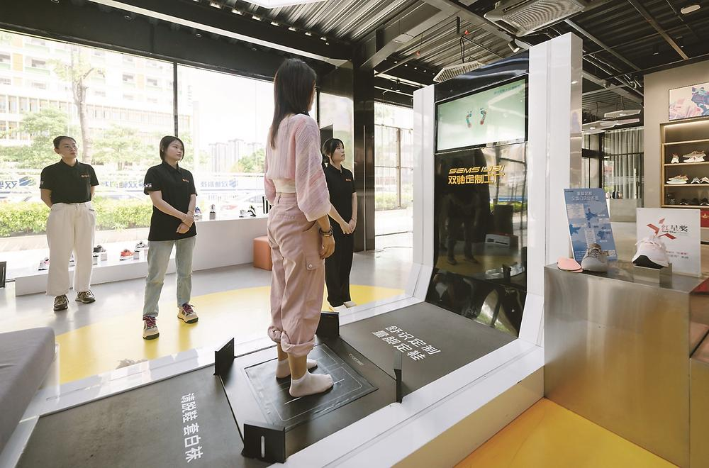 莆田双驰科技定制工厂里,消费者在使用3D脚型扫描仪,15秒即可完成54项足部数据测量,匹配最合适的鞋楦和鞋垫。数据直连工厂,最快2个小时后,一双“量脚打造”的新鞋就能走下生产线。