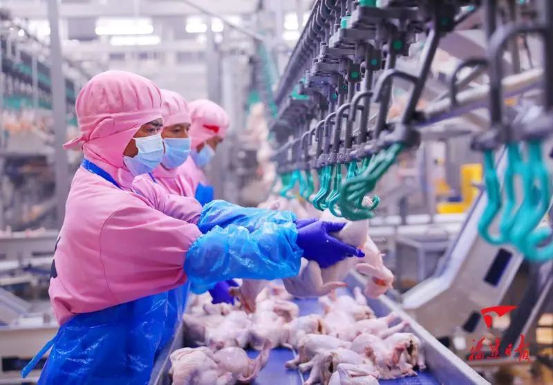 圣农发展有限公司加工车间,工人正在生产线上忙碌。