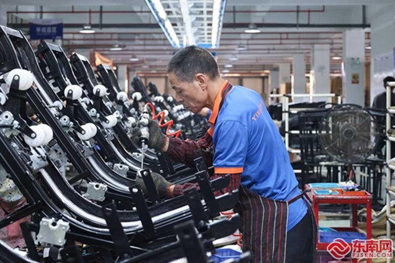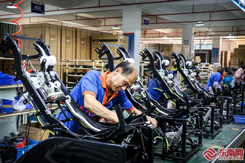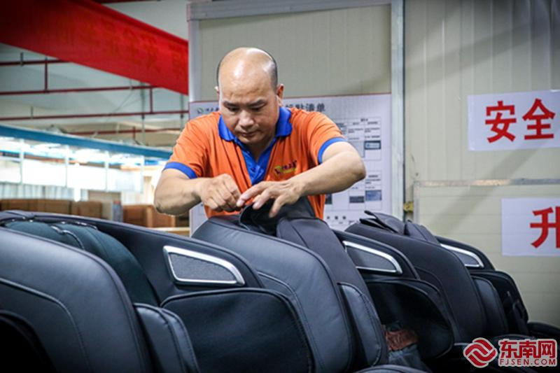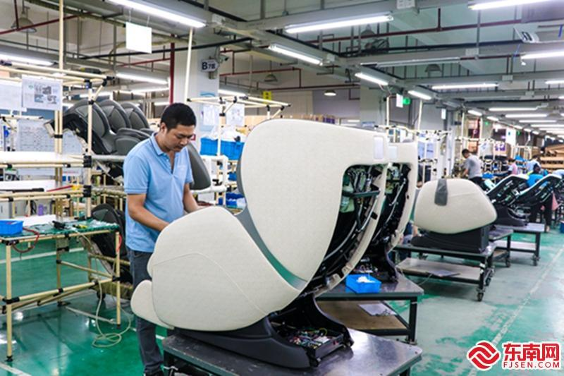 福建怡和电子有限公司智能生产线上,工人们正在组装按摩椅。