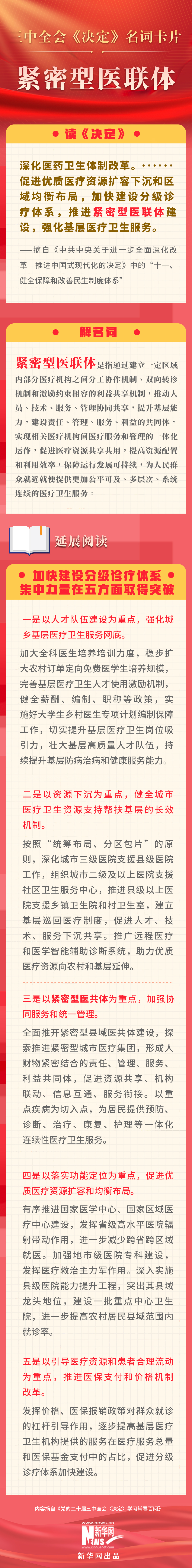 党的二十届三中全会审议通过了《中共中央关于进一步全面深化改革、推进中国式现代化的决定》。新华网依据《党的二十届三中全会〈决定〉学习辅导百问》,制作三中全会《决定》系列名词卡片,和大家一起来深入学习领会二十届三中全会精神。本期名词是“紧密型医联体”。