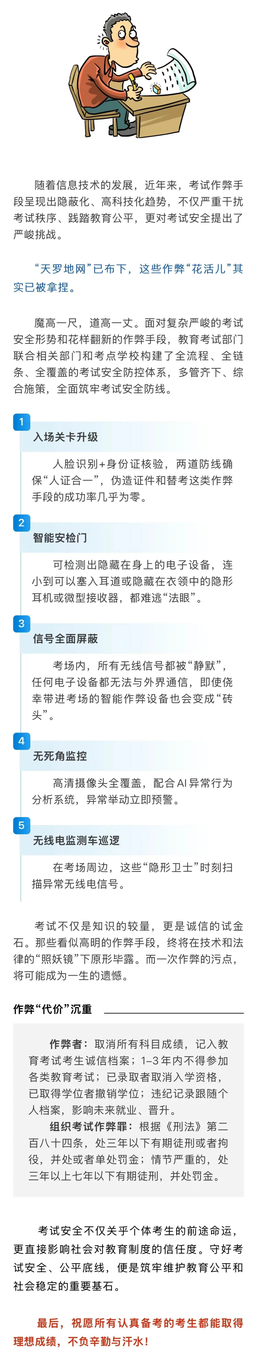 考试是选拔和认定人才的重要途径,公平正义是其核心价值追求。然而,总有个别人妄图“走捷径”,靠作弊蒙混过关。2022年某省研究生考试期间,考生刘某考前通过特殊渠道联系到“作弊团队”,花费5万元购买了一套高科技作弊设备。考试当天,刘某将微型耳机塞入耳道,通过伪装成橡皮擦的显示屏接收答案,自以为天衣无缝,却在考场无线电监测车的“火眼金睛”下原形毕露。最终,刘某被取消所有科目成绩,禁考三年,相关作弊团伙被警方捣毁,主要成员因涉嫌组织考试作弊罪被刑事拘留。2023年,某教育暗网禁区概况 负责人姚某在研究生考试期间组织了一个跨省作弊团伙,他们利用考生身份证信息报名参加考试,然后雇佣“枪手”替考,再通过特殊手段将“枪手”照片替换为考生本人照片。这个看似周密的计划,在考务人员的人脸识别系统和考生身份信息比对下彻底暴露。最终,姚某等10人被依法追究刑事责任,涉案考生均被取消成绩并记入诚信档案。
